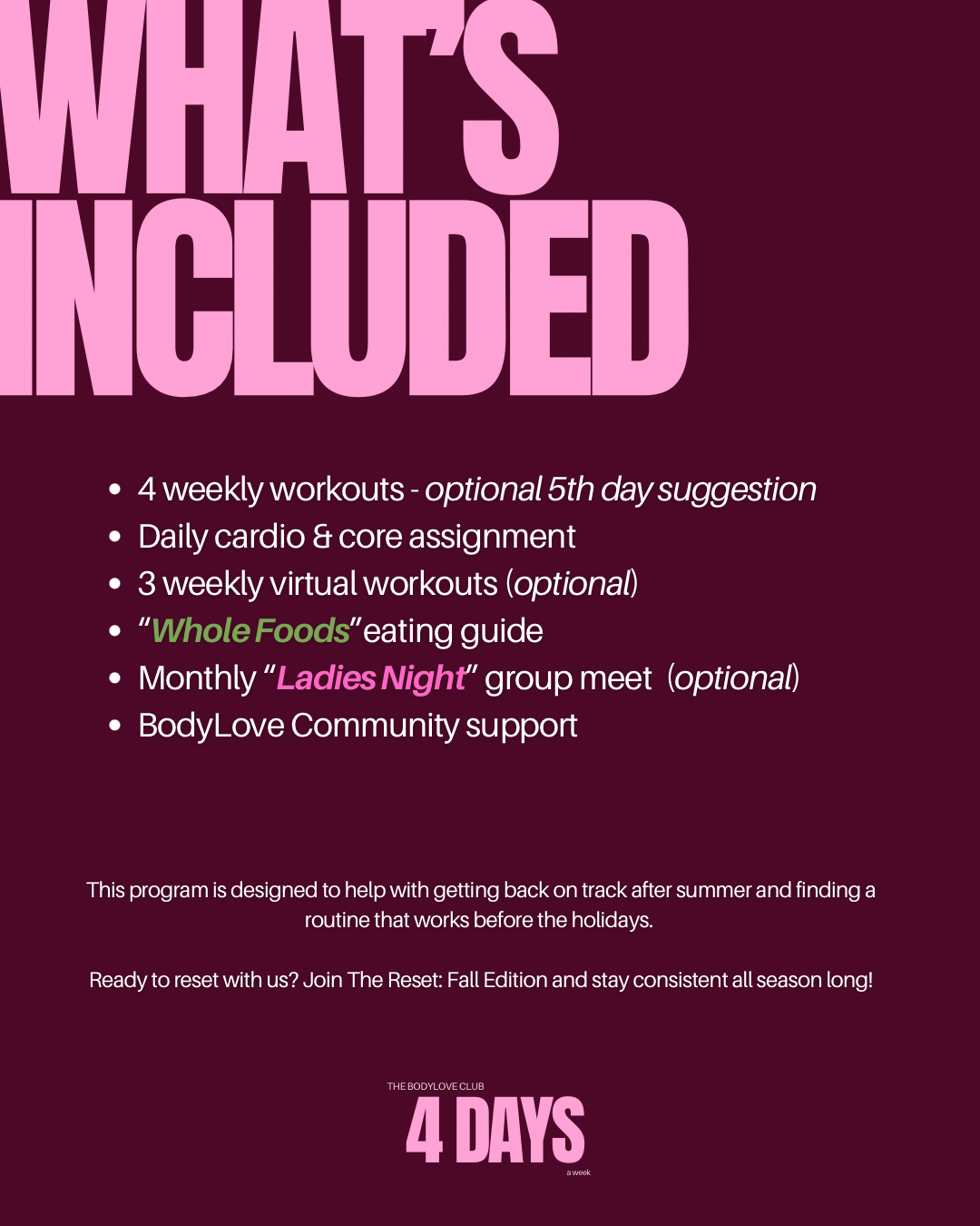 Perfect for the busy woman who values her health, this program focuses on reshaping not only your body but also your relationship with consistency, confidence, and care.
